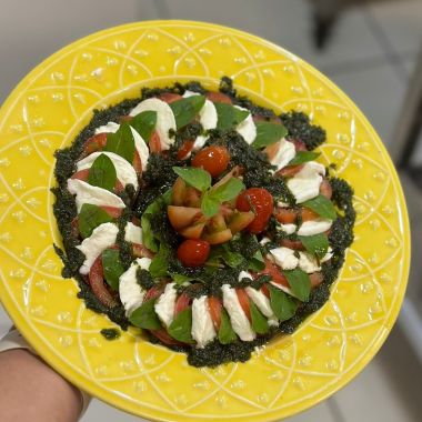 Tomate. mussarela de búfala, manjericão, azeite de oliva e pesto de manjericão