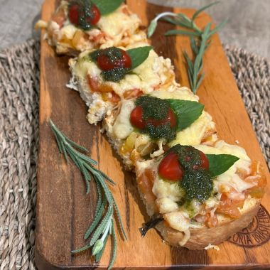 Burrata de búfala, molho pesto de manjericão, tomate confit, rúcula. Acompanha torradas artesanais