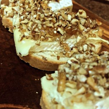 Pão da casa dourado no azeite de oliva com queijo brie, nozes e geleia de pimenta