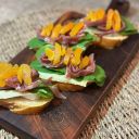 Pão da casa, rucula, queijo brie, presunto parma e damasco.